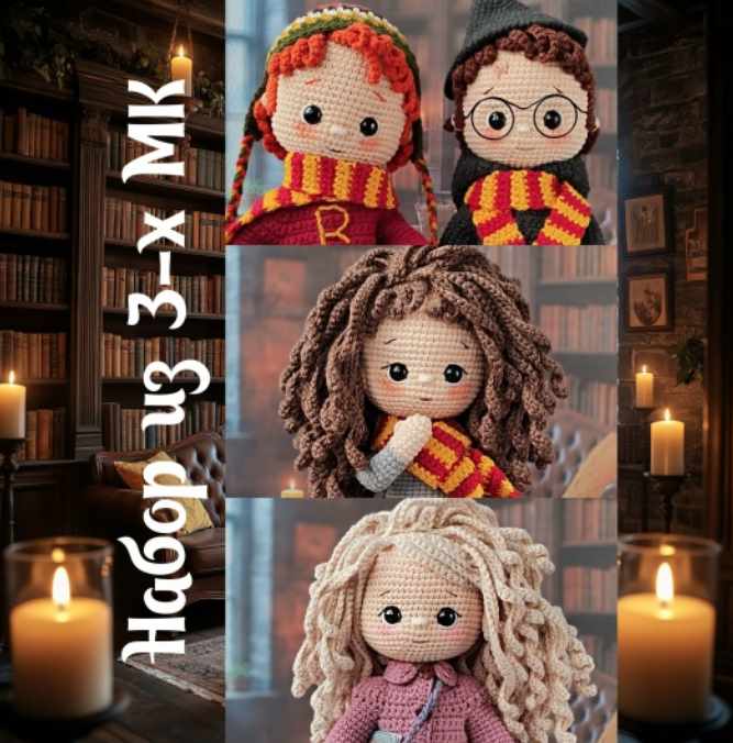 "Волшебник и его Друг": Игрушка на проволочном каркасе, вяжется снизу вверх, «полукрестиками», по спирали. Руки ввязываются, голова пришивается. Парик вяжется отдельно и пришивается. Глазки на безопасном креплении. Мантия, свитер, головные уборы и шарфы съёмные. При использовании указанных материалов, высота готовой игрушки око-ло 24-25 см.